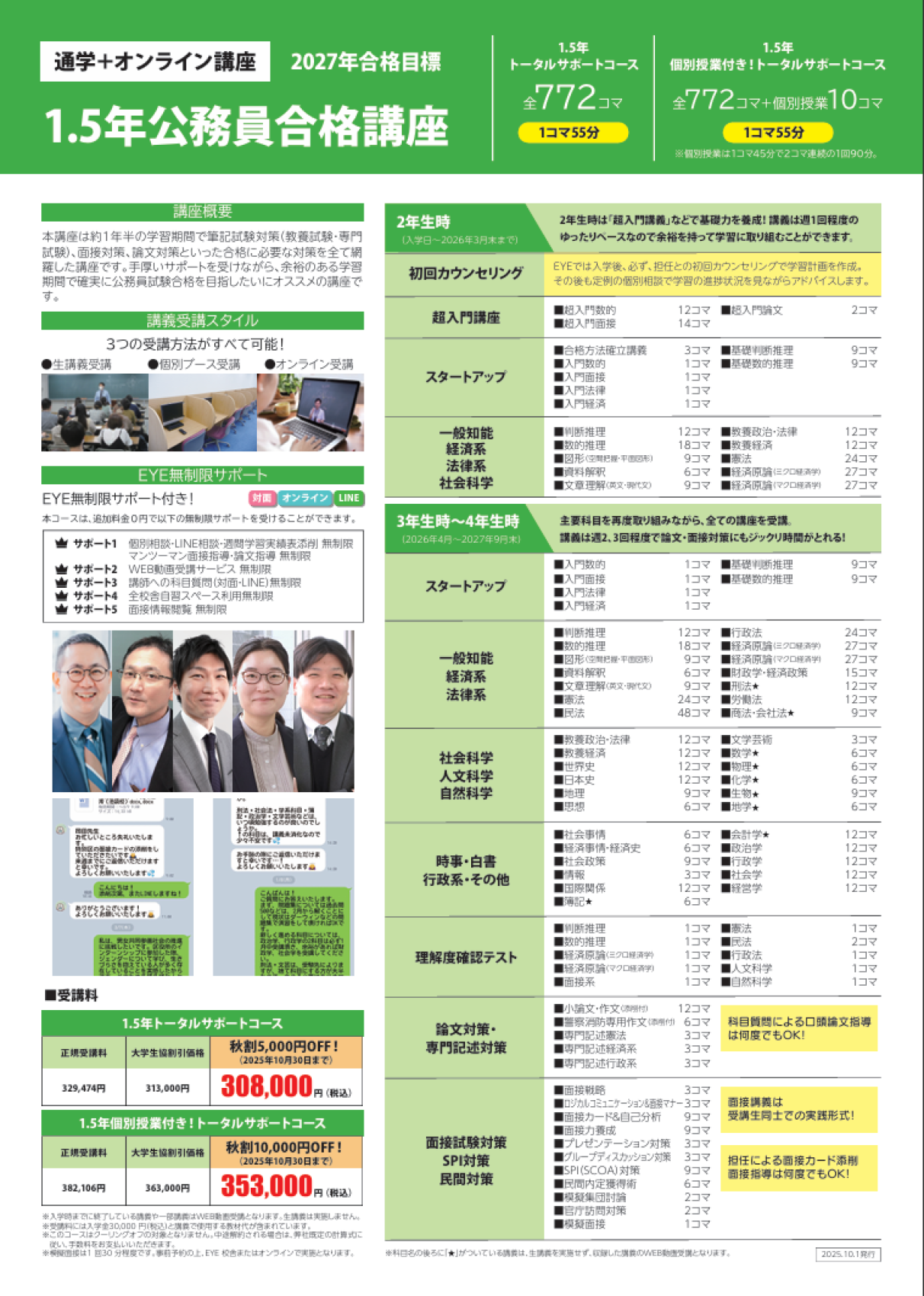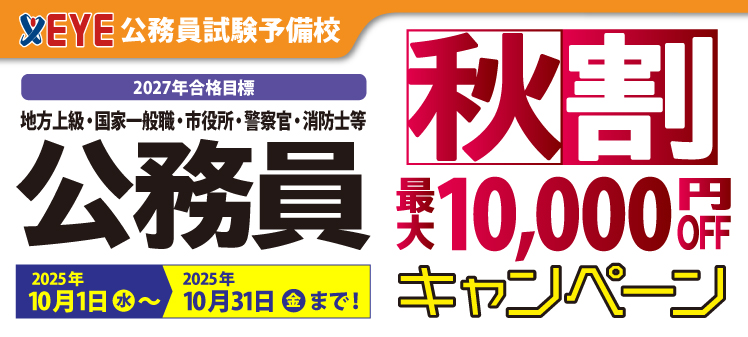 ※大学によって「大学別オリジナル公務員講座」のキャンペーンをご案内していますので、EYE各校までお問い合わせください。「秋割キャンペーン」として、対象にコース受講料を正規受講料から 「最大10,000円OFF」させていただきます。